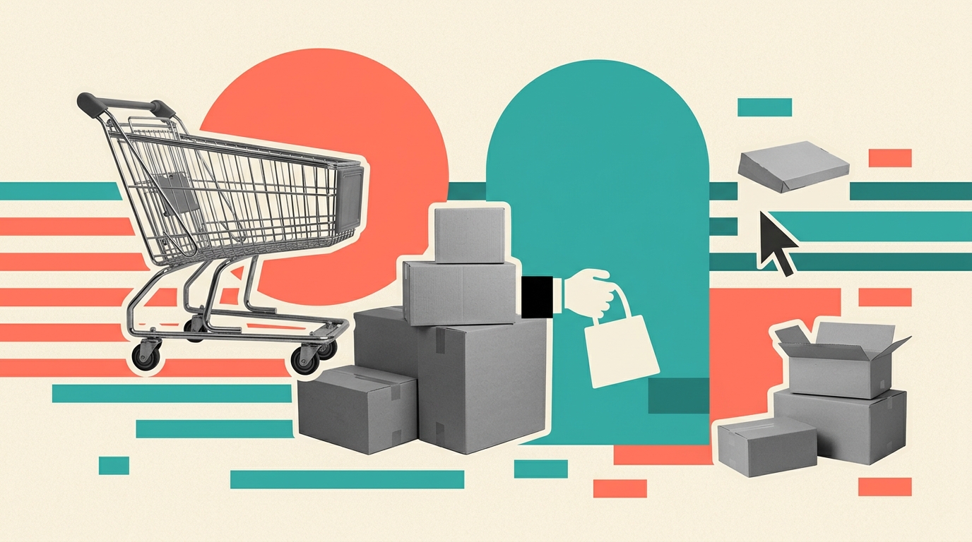 Illustration: abstract network diagram of customer profiles, ecommerce dashboard showing customer segments, venn diagram of o